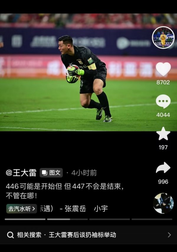 8月3日讯 泰山客场1-2不敌蓉城的比赛结束后,王大雷更新社媒,为自己送上了鼓励。 本场比赛王大雷将自己保持的国内顶级联赛出场纪录刷新到了447场,遗憾的是他在比赛中染红下场,最终泰山也在客场输球。 赛后,王大雷在社媒写道:“446可能是开始但,但447不会是结束,不管在哪!”......查看更多