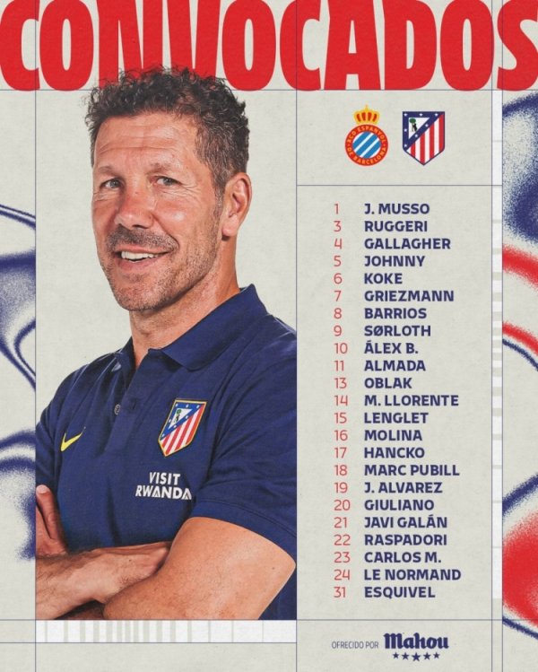 8月17日讯 北京时间8月18日凌晨3:30,2025-26赛季西甲联赛第一轮,马德里竞技将客战西班牙人。赛前,马竞官方公布了本场比赛球队大名单,新援卡尔多索阿尔马达均在列。 马竞本场比赛大名单如下: 门将:1-穆索、13-奥布拉克、31-埃斯基韦尔 后卫:15-朗格莱、16-莫利纳、17-汉茨科、18-普比尔、21-哈维-加兰、24-勒诺尔芒 中场:3-鲁杰里、4-加拉格尔、5-卡尔多索、6-科克、8-巴里奥斯、11-阿尔马达、14-略伦特 前锋:7-格列兹曼、9-索尔洛特......查看更多