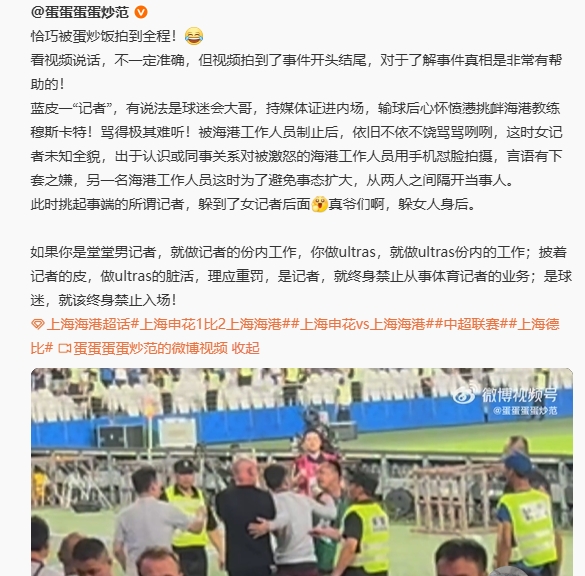 昨晚进行的中超第20轮焦点战,上海申花1-2上海海港,赛后一段视频在网崇高传,包括穆斯卡特翻译在内的海港使命主说念主员与申花记者许玥发生争持。
