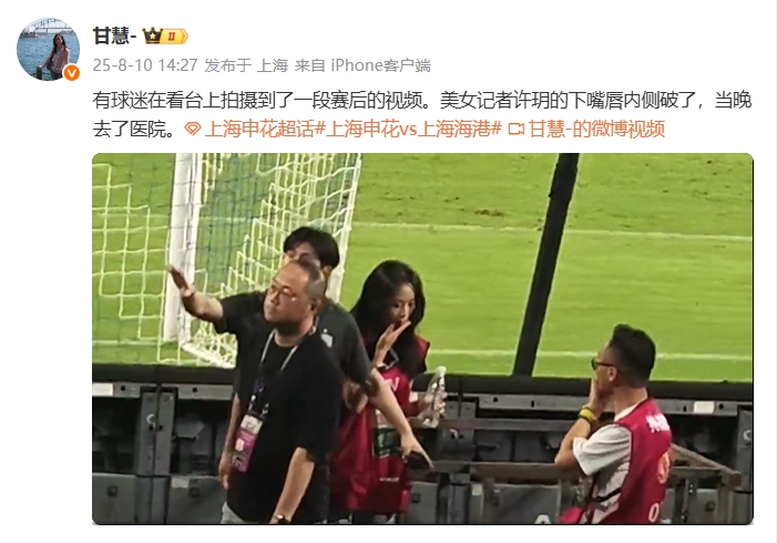 事件启事是因为海港东说念主员赛后谢场时平直踩踏带有申花符号的地毯。本日据申花跟队甘慧败露,记者许玥下嘴唇内侧破了,当晚去了病院。