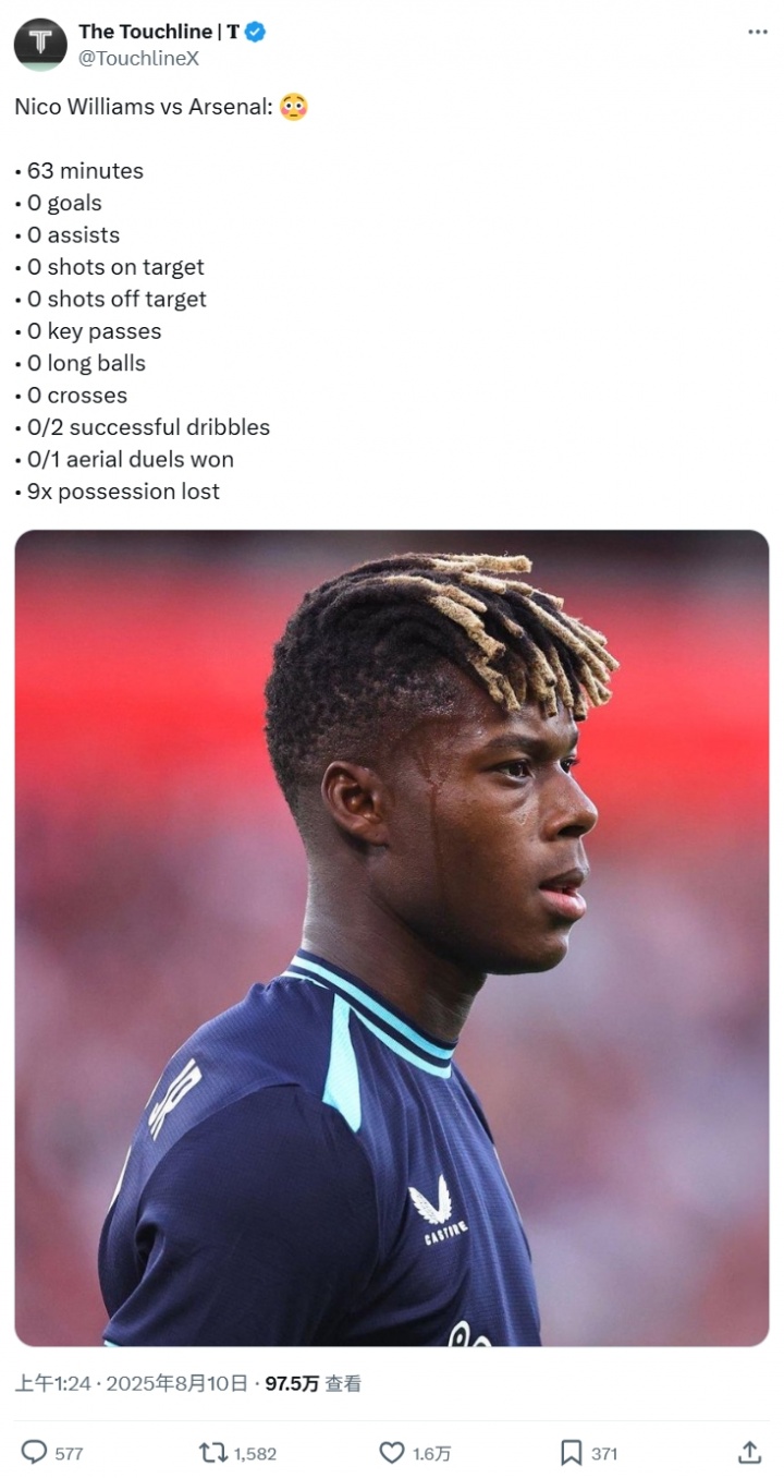 08月10日讯 毕尔巴鄂竞技在酋长杯中0-3负于阿森纳,身价7000万欧的尼科-威廉姆斯发达时时,再度激勉球迷热议。