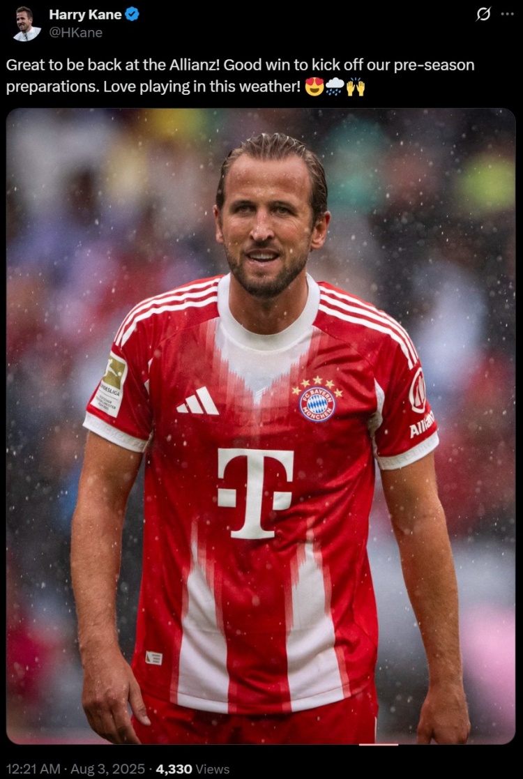 赛后凯恩在社媒发文:很欣喜再次回到安联球场,这场胜利拉开了咱们季前备战的序幕,心爱在这么的天气里踢球!
