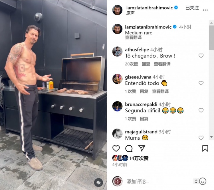 肌肉线条还是明显!44岁伊布晒赤裸上身烤肉视频:五分熟