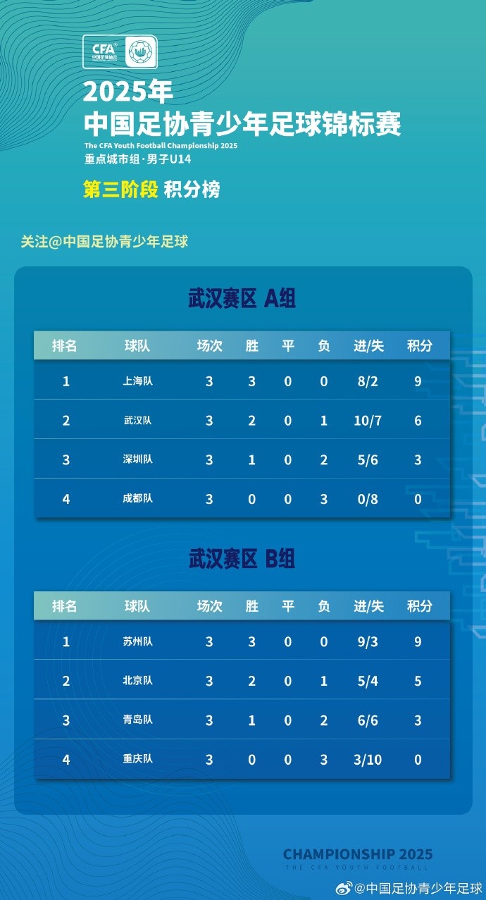 2025年中国足协青少年足球锦标赛重心城市须眉U14组第三阶段第3轮赛果+积分榜 🎙️