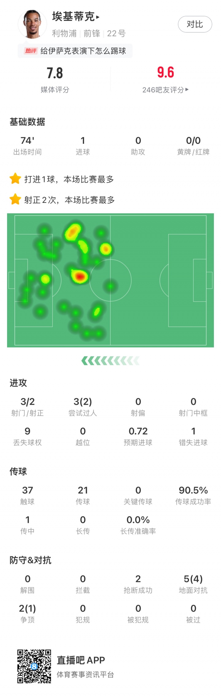 伊萨克腹股沟不适,半场被换下。维尔茨本场孝顺2次助攻,埃基蒂克攻入一球。