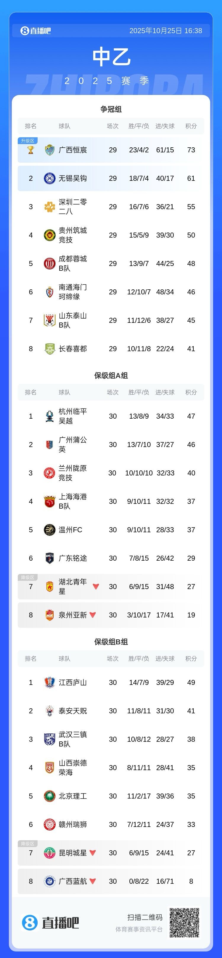 10月25日讯 2025赛季中乙联赛保级组纵脱沿路争夺,保级组A组,湖北后生星、泉州亚新左迁,保级组B组,昆明城星、广西蓝航左迁。