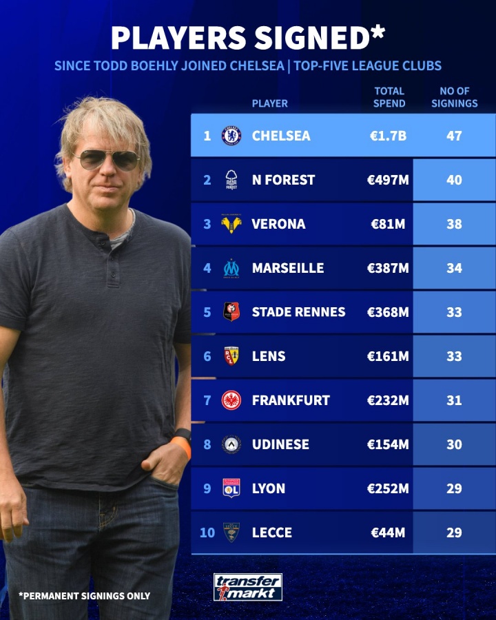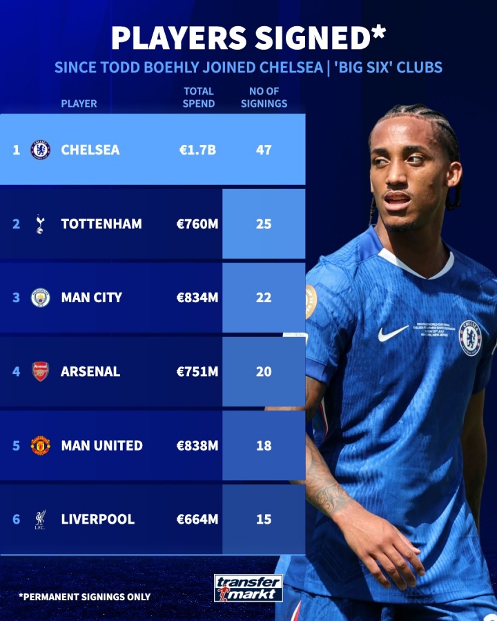 英超big6引援用度及东谈主数:切尔西破耗17亿欧签下47名球员,断档卓越↓