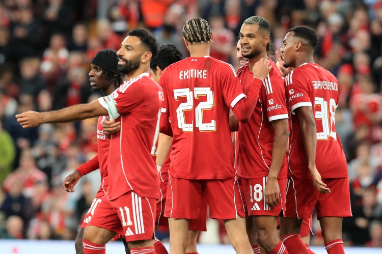 利物浦首发:25--玛玛达什维利、5-科纳特、6--科尔克兹、30-弗林蓬、38-赫拉芬贝赫、3-远藤航、7-维尔茨、8-索博斯洛伊、18-加克波、11-萨拉赫、22-埃基蒂克