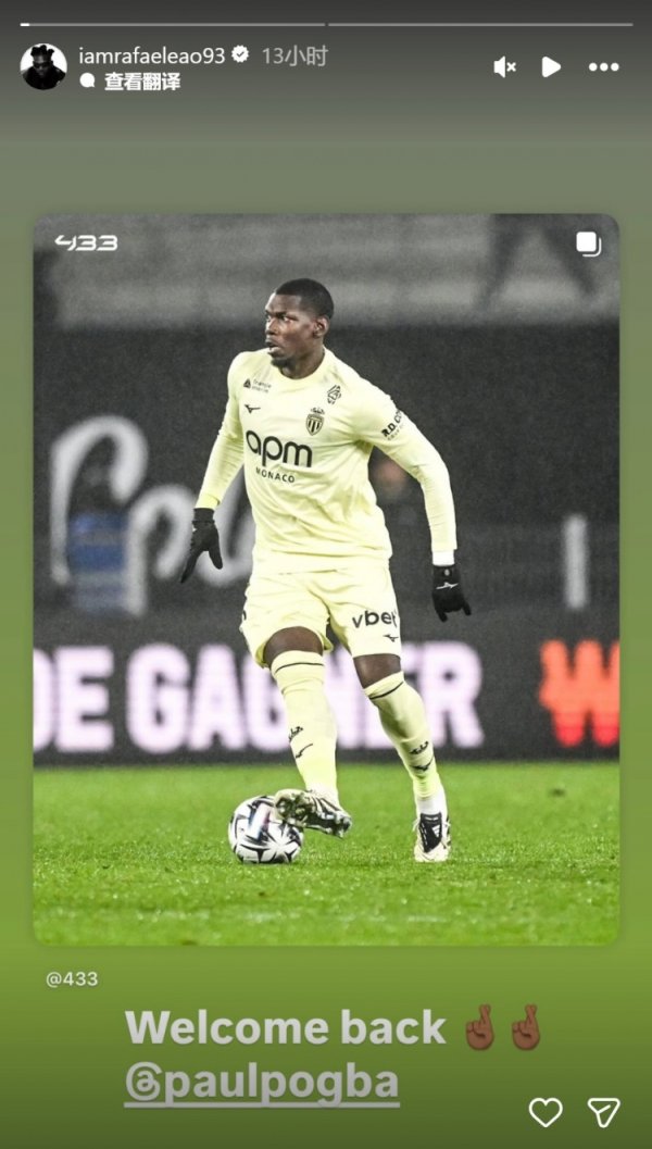 莱奥社媒转发博格巴相片,道喜他重返赛场:宽宥纪念