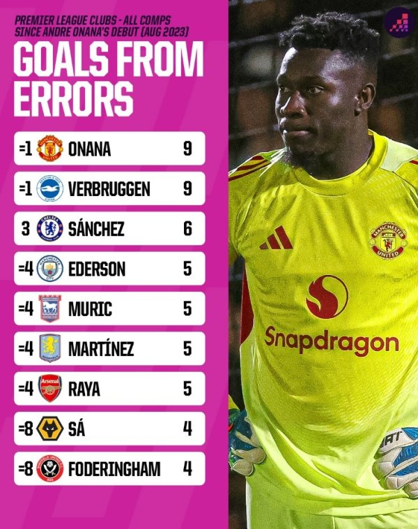 9月9日讯 曼联门将奥纳纳离队在即,OPTA也盘货了自奥纳纳2023年8月加盟曼联以来,英超系数门将在各项赛事出现颠倒导致失球数,奥纳纳比肩最多。具体如下: 1、奥纳纳(曼联)、韦尔布鲁根(布莱顿)9次 3、桑切斯(切尔西)6次 4、埃德森(曼城)、穆里奇(伊普斯维奇)、马丁内斯(维拉)、拉亚(阿森纳)5次 8、若泽-萨(狼队)、福德林汉姆(谢菲联)4次......查看更多