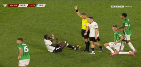 被吹违反犯规!吕迪格染黄,下轮主场vs卢森堡将累计黄牌停赛