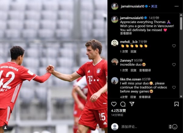 8月12日讯 35岁的穆勒夏窗离开拜仁,加盟温哥华白浪,穆西亚拉更新个东说念主社媒晒出两东说念主合照,为穆勒奉上祝颂。 穆西亚拉社媒写说念:感谢你所作念的一切托马斯🙏🏽祝你在温哥华一切告成,一定会念念念你的❤️......查看更多