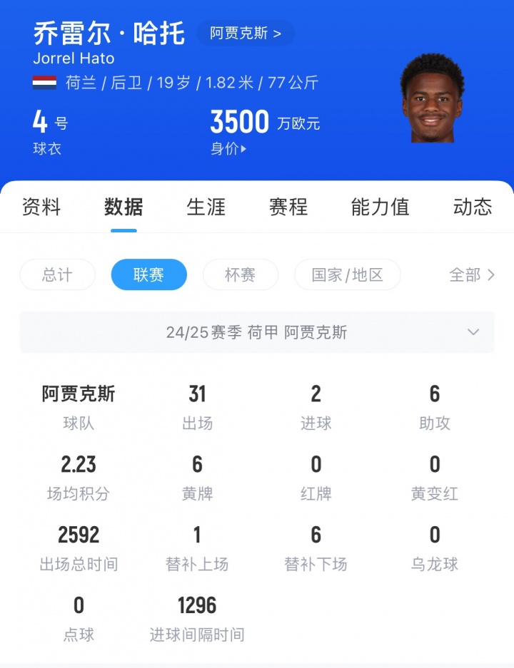 19岁的哈托司职后卫,出自阿贾克斯青训,现时身价3500万欧元,上赛季他在荷甲出场31次,孝顺2球6助。