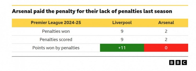 上赛季利物浦因为点球而多拿了11分,相较之下阿森纳莫得因为点球抢到荒谬的积分