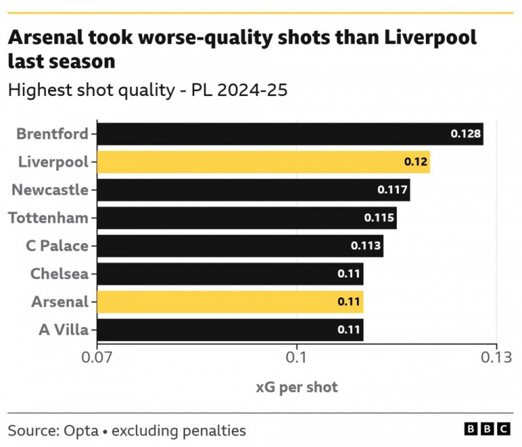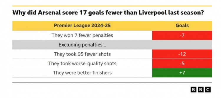 上赛季阿森纳点球比利物浦少7次,非点球射门少95(少了12球),射门质料也要差一些