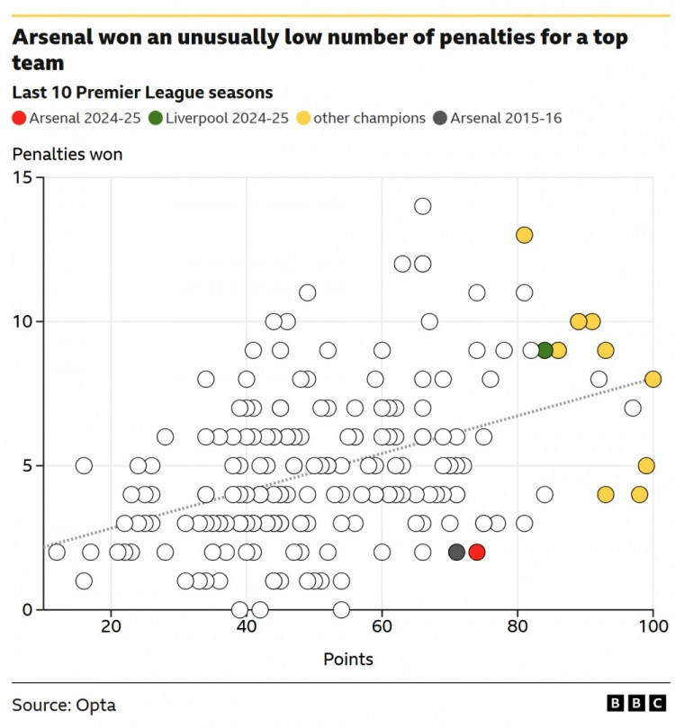 最近10个赛季,阿森纳在英超获取点球的次数皆很低