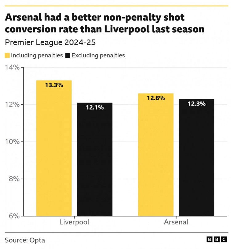 利物浦上赛季射门升沉率13.3%,比阿森纳的12.6%高,但这数据有点“水分”,要道就在点球。赤军赢下并罚进了英超最多的9个点球,枪手呢?只捞到并打进了惘然的2个。