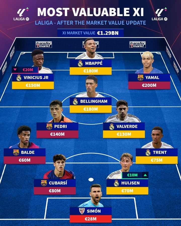 身价12.9亿欧!德转列西甲最贵阵:中前场6东谈主一皆上亿 无马竞球员