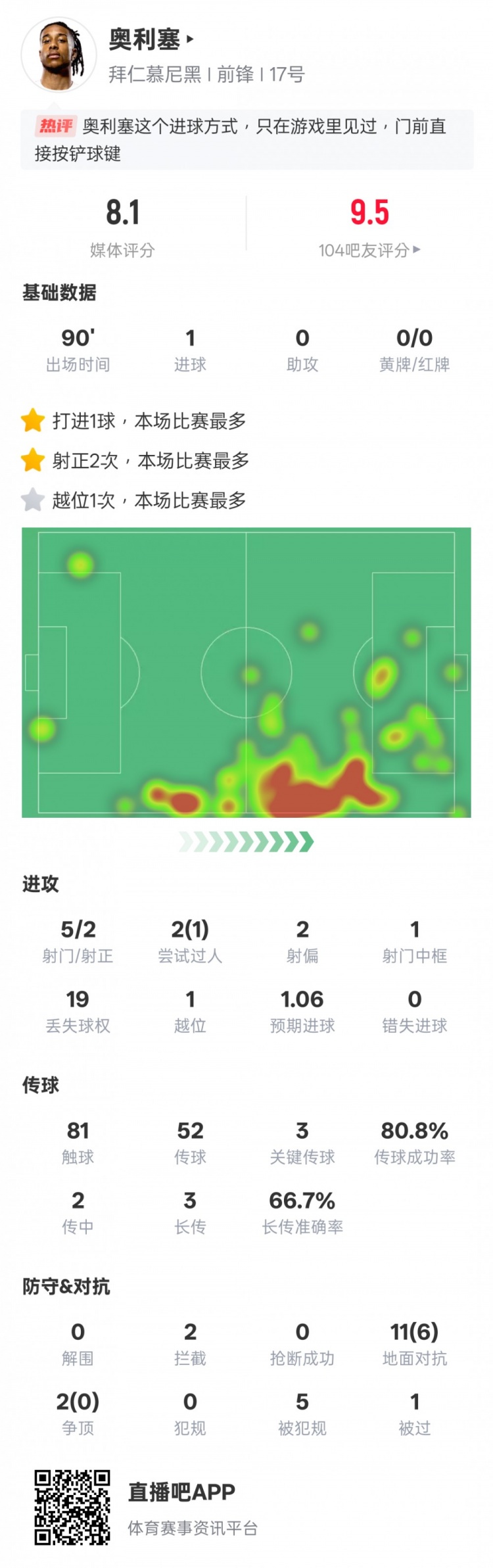 奥利塞本场数据:1进球3要道传球1过东谈主得手,评分8.1