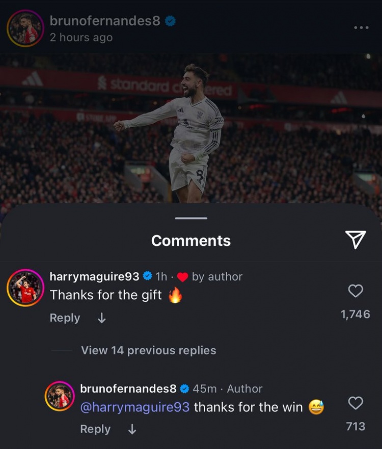 B费赛后社媒晒照庆祝到手,马奎尔留言:“谢谢你的礼物。”