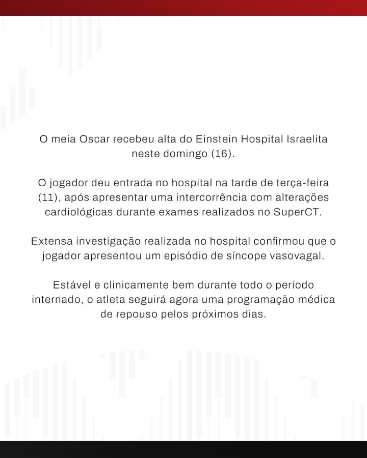 11月16日讯 圣保罗官方发布公告,此前体检时晕厥的奥斯卡如故获准出院,当今情况致密。