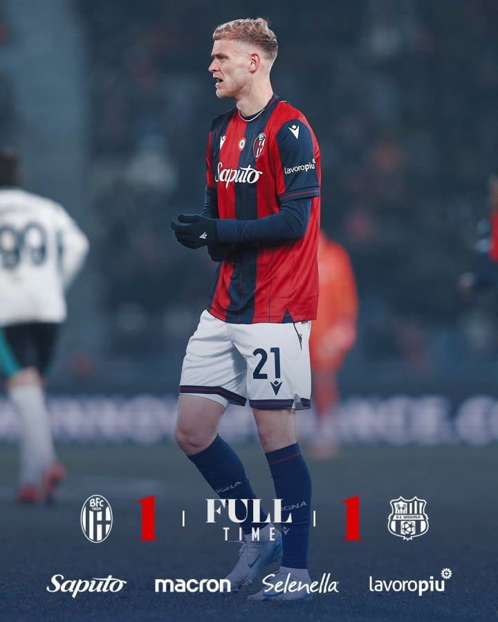 北京时分12月29日01:00,意甲第17轮,博洛尼亚镇守主场迎战萨索洛。比赛中,佐尔泰亚送出精确助攻,法比安稳固破门为博洛尼亚获取跳跃。随后,劳里恩特凯旋瞎想紧迫,穆哈雷莫维奇收拢契机扳平比分。两边均未能再度改写比分,最终以1-1合手手言和。
