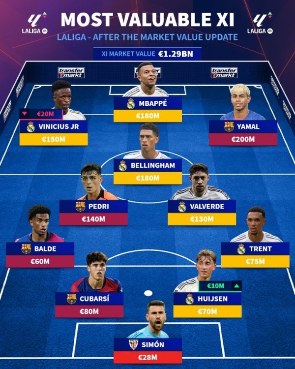 10月02日讯 德转统计了西甲最贵11东谈主声势,皇马6东谈主上榜巴萨4东谈主上榜,惟一非皇萨的球员是毕尔巴鄂的门将乌奈-西蒙。 西甲最贵11东谈主声势: 前卫:维尼修斯-1.5亿欧,姆巴佩-1.8亿欧,亚马尔-2亿欧 中场:佩德里-1.4亿欧,贝林厄姆-1.8亿欧,巴尔韦德-1.3亿欧 后卫:巴尔德-6000万欧,库巴西-8000万欧,赫伊森-7000万欧,阿诺德-7500万欧 门将:乌奈-西蒙-2800万欧......查看更多