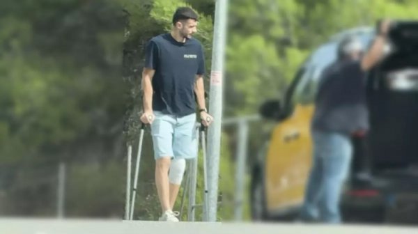 刚汲取膝盖手术!霍安-加西亚被拍到拄拐现身巴萨基地