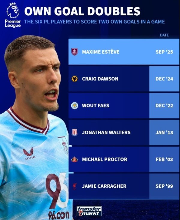 英超单场乌龙双响“祸害蛋”:卡拉格、艾斯特福、谈森、法斯在列
