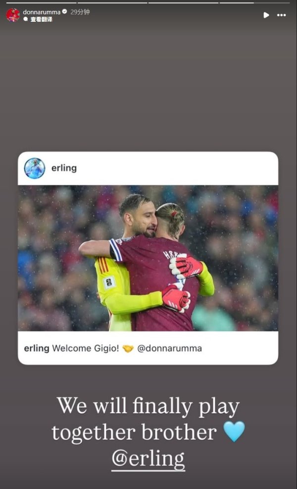 9月6日讯 多纳鲁马在Instagram发文,回答哈兰德的迎接。 哈兰德此前在酬酢媒体晒出我方与多纳鲁马拥抱的像片,并配文:“迎接你,多纳鲁马!” 多纳鲁马随后转发并写谈:“咱们终于不错一王人踢球了,昆季!”......查看更多