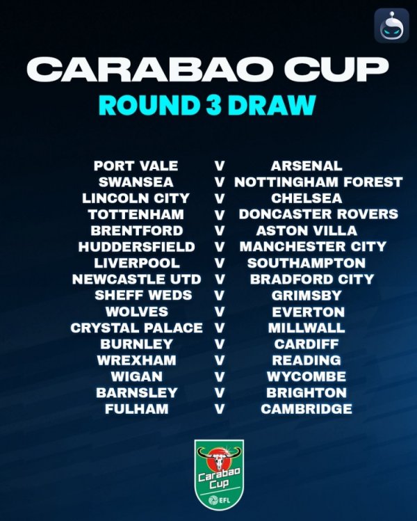 8月28日讯 英格兰联赛杯第三轮抽签效果揭晓,具体如下: 维尔港 - 阿森纳 斯旺西 - 诺丁汉丛林 林肯城 - 切尔西 托特纳姆热刺 - 唐卡斯特流浪者 布伦特福德 - 阿斯顿维拉 哈德斯菲尔德 - 曼城 利物浦 - 南安普顿 纽卡斯尔联 - 布拉德福德城 谢周三 - 格里姆斯比 狼队 - 埃弗顿 水晶宫 - 米尔沃尔 伯恩利 - 加的夫城 雷克瑟姆 - 雷丁 维冈竞技 - 韦康比流浪者 巴恩斯利 - 布莱顿 富勒姆 - 剑桥联......查看更多